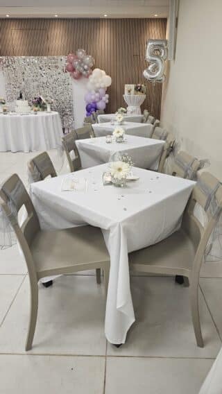 - Table, chairs or bistro table set up and Party decoration.